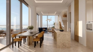 Where the display of contemporary architecture puts an emphasis on flair and function, Aria by Beyond is purposefully composed inside and out. The facade of this waterfront structure is distinguished by sleek geometric lines, glazed panels, porcelain coating, and metal louvers, creating a streamlined appearance where sea, sand, and sky are all woven together while offering longevity and durability. Stepping inside the world of sophistication, you will be greeted by elegant finishes that exude a sense of timeless luxury, an open-plan concept and high ceilings that add an illusion of space, and modern fittings. A magnificent feature of the waterfront location, each unit is designed with balconies and floor-to-ceiling glass windows and sliding doors positioned to offer breathtaking sea views, modern kitchens, and homey bedrooms that will leave you speechless.